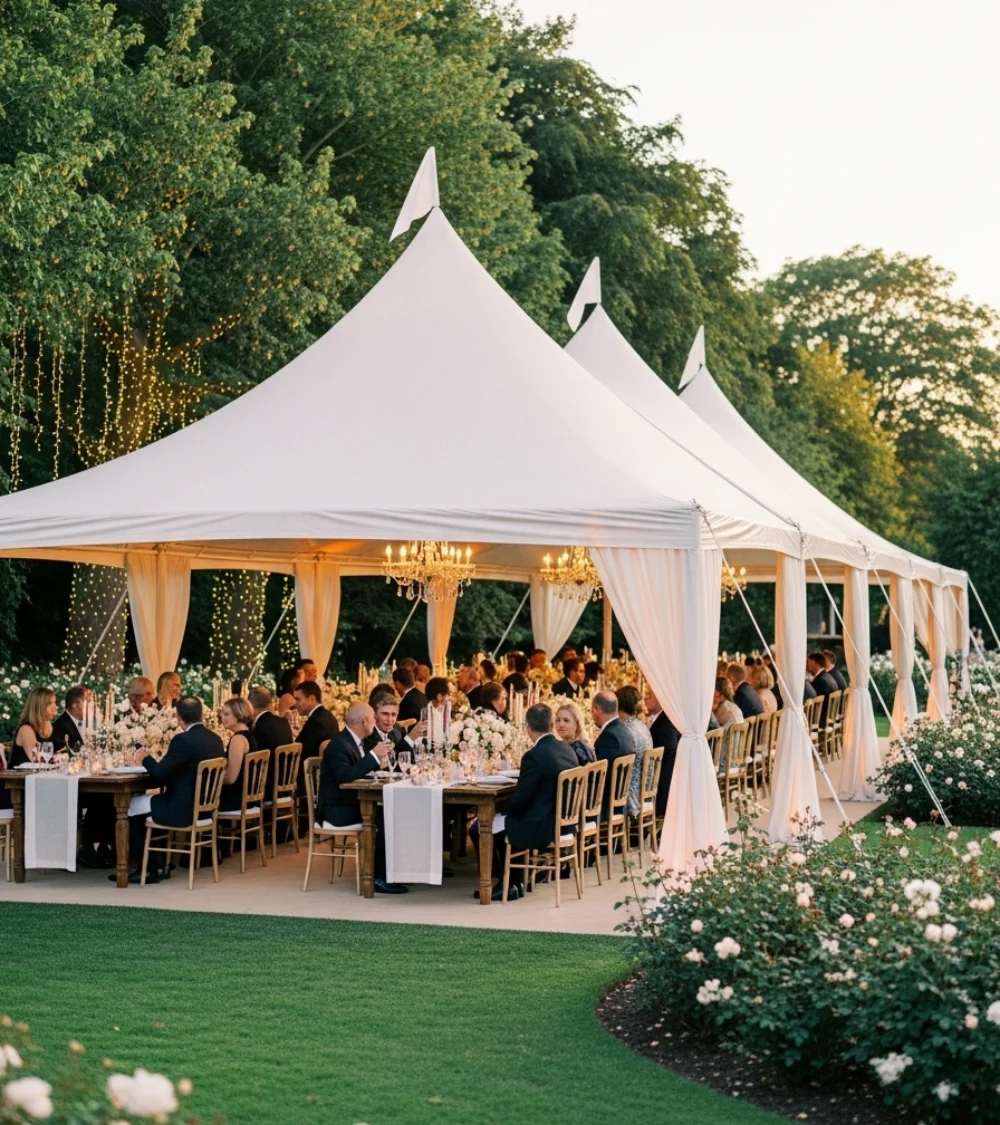 Classic white tents perfect for large gatherings, celebrations, and community events.