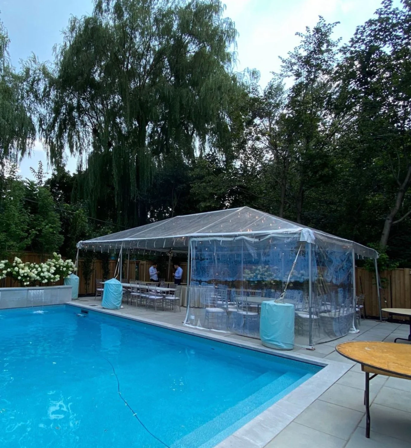 Popular events include wedding receptions, engagement parties, backyard celebrations, corporate events, and private dinners. The clear design allows décor, lighting, and outdoor views to stand out during the event.