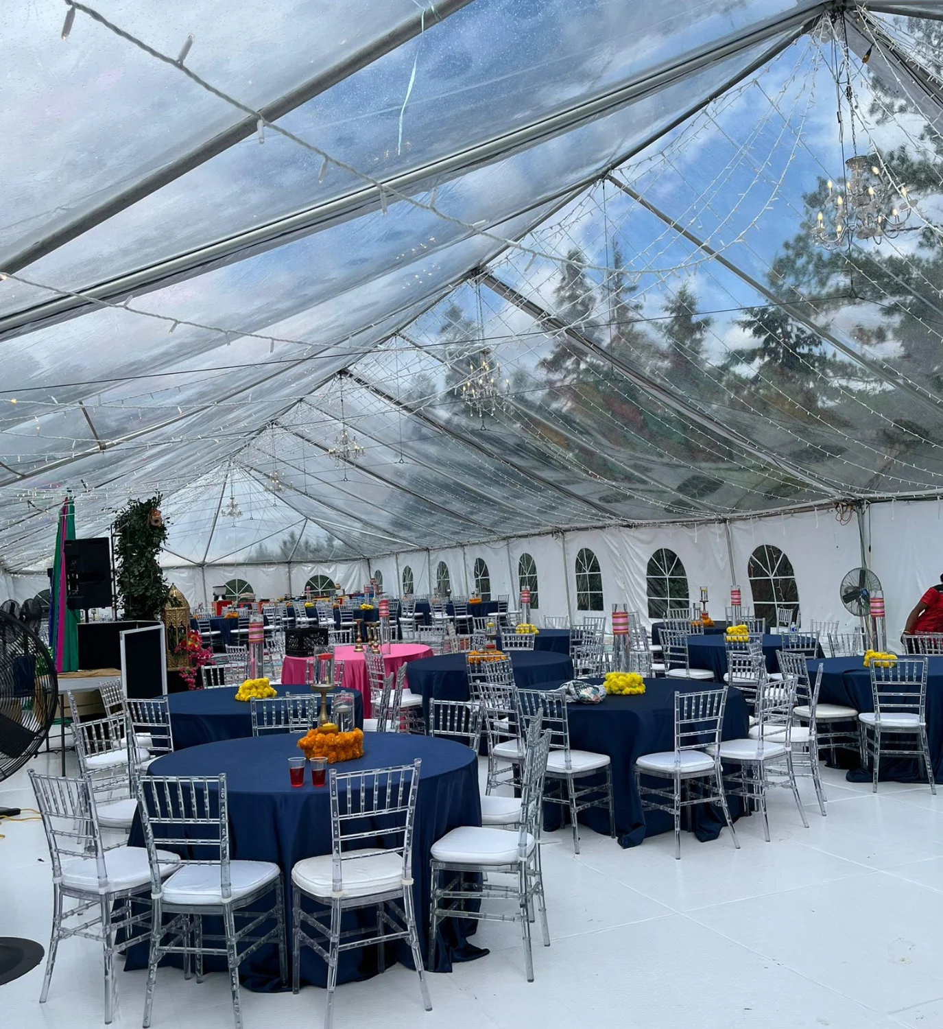 Yes. Many events install chandeliers or string lights inside transparent tents.